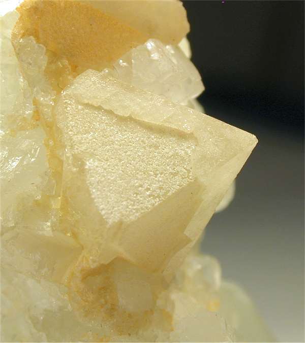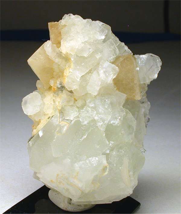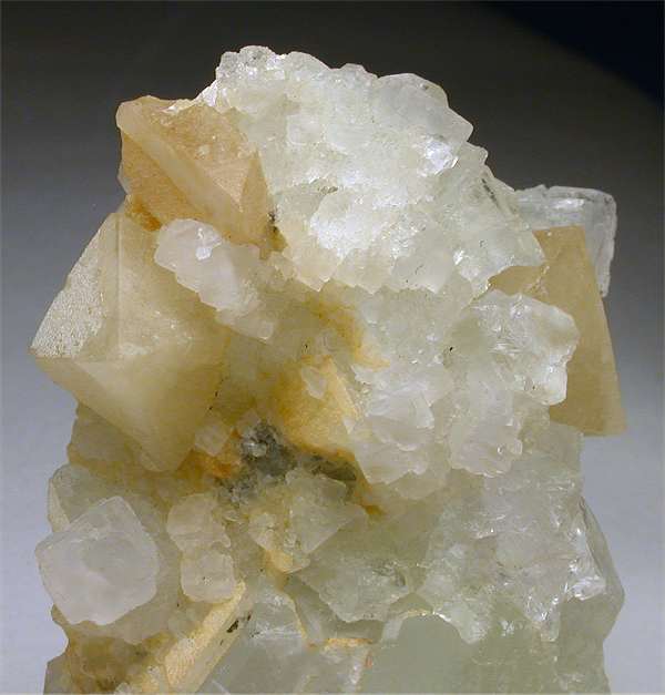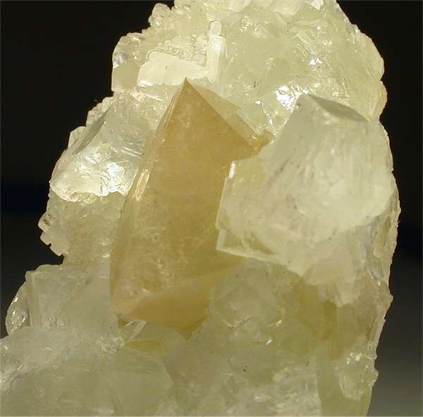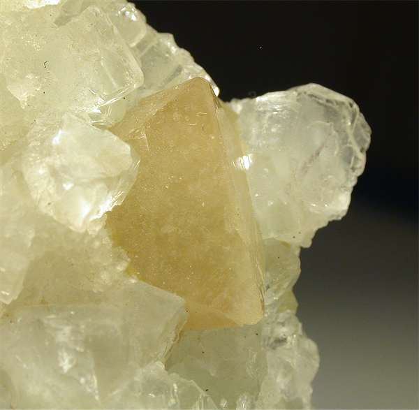 Xianghualin, Hunan Prov., China - There are three perfectly terminated scheelite crystals that emerge from various fluorite cubo-octahedrons ! The scheelite show a light brown/orange color and are 1-1.5 cn on the edge ! Very nice specimen of 6.5x4.5x3 cm