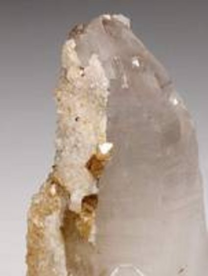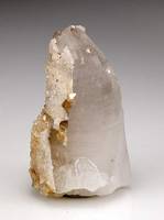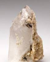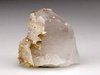 Yaogangxian Mine, Chenzhou, Hunan, China - Small Brown crystals of scheelite to 0.3 cm in size upon the single terminated glassy partly gemmy quartz crystal 4.5 x 2.5 x 2.0 cm in size. Calcite present as well. Minimal micro-chipping present, still in very good condition