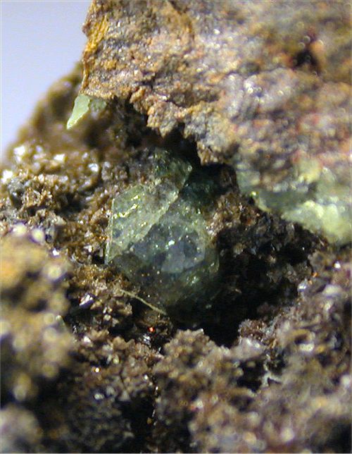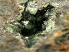 Pingtouling Mine, Guangdong Province, China - Very nice specimen of scorodite with several millimetric crystals up to 2-3 mm in size. They show a nice bright deep green/blue color. There are nice coatings inside cavities all over this rock ! Overall size is 4x4x3.5 cm. Ex Trinity Minerals collection.