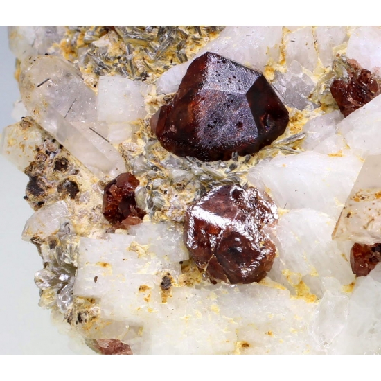 Nyet Bruk, Shigar, Northern Areas, Pakistan - Bright red spessartine crystals to the size of 0.7 cm show on albite together with some quartz crystals. Bnice specimen of 5.1 × 3.7 × 3.3 cm in size.