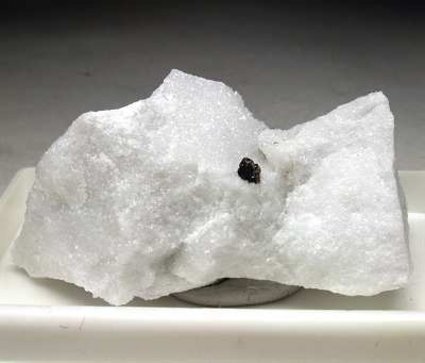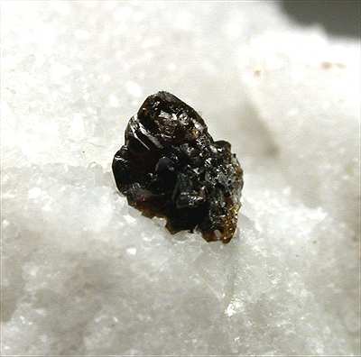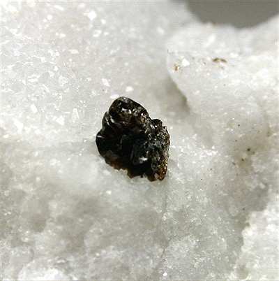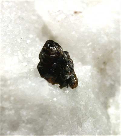 Calagio, Colonnata quarry, Apuane Alps, Carrara, Italy - A dark brown sphalerite crystal shows up on the white marble. The sphalerite is close to 0.3 cm. Overall size of the specimen is 4.5x2.5x2 cm.