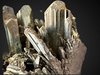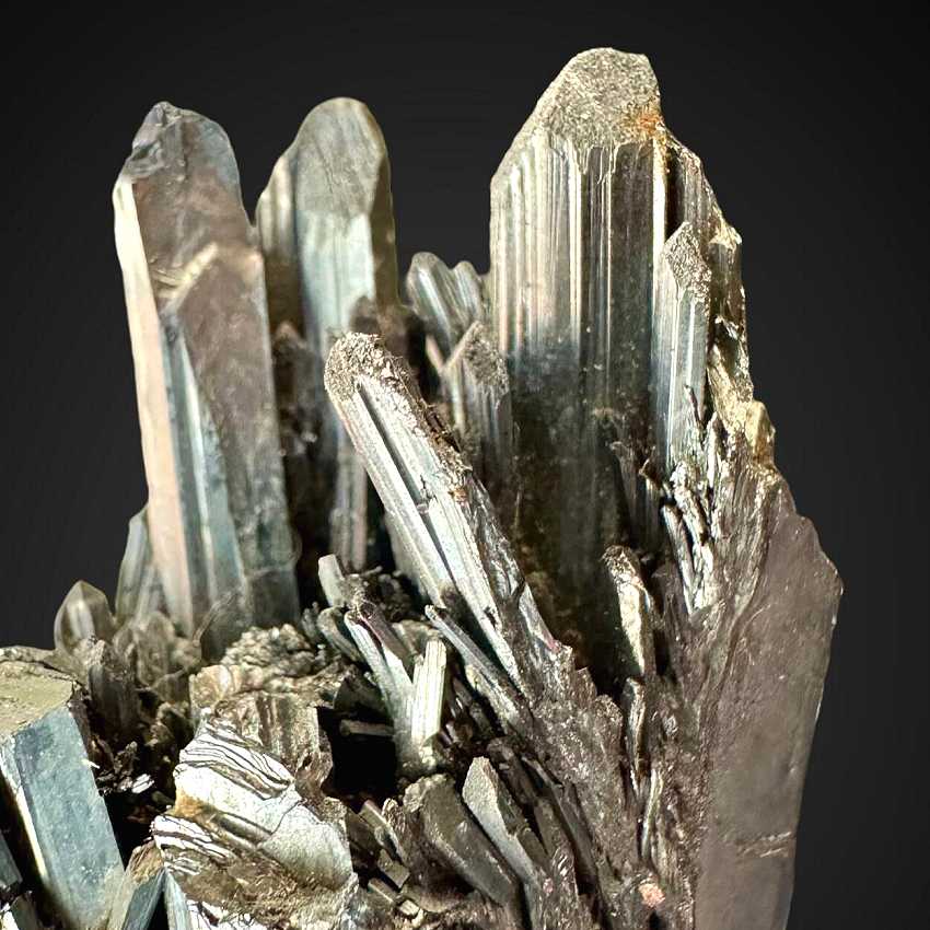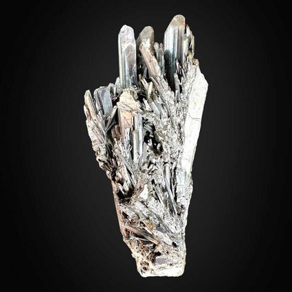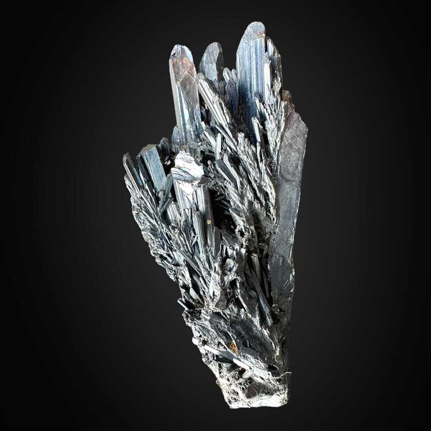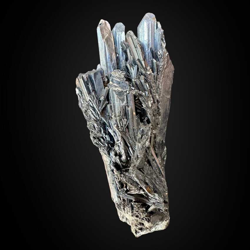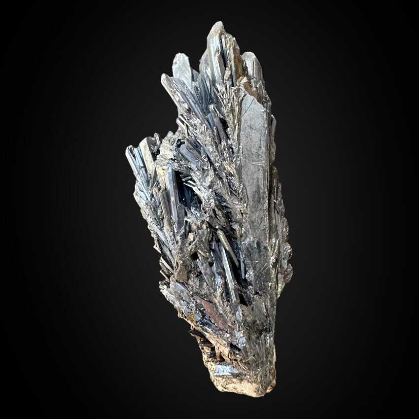 Baia Sprie Mine, Baia Sprie, Maramureș County, Romania - A small group of divergently formed steel like crystals of stibnite. The main crystals show typical Baia Sprie spear like terminations. Overall size is 5.4 × 2.5 × 1.6 cm. Weight is 35 gr
