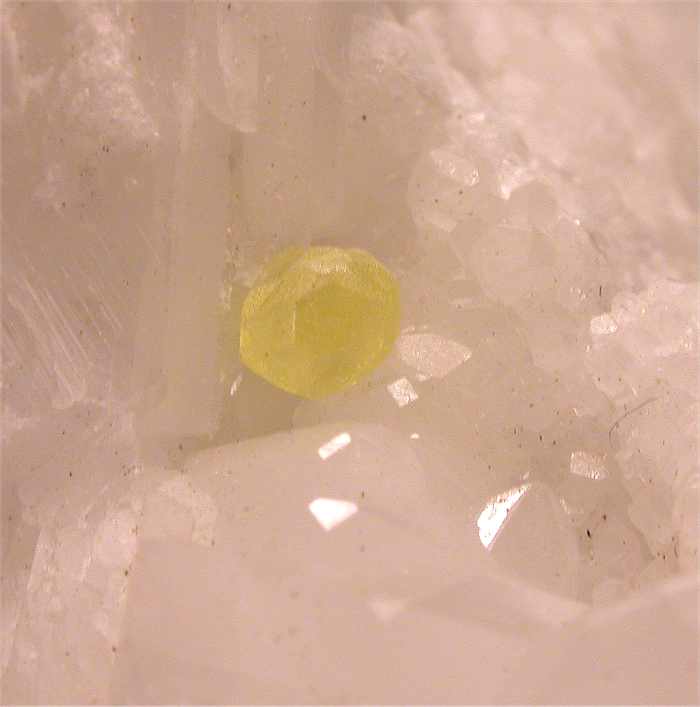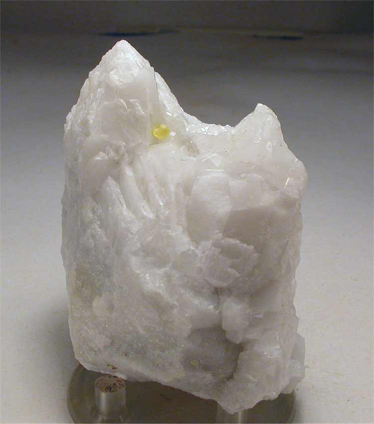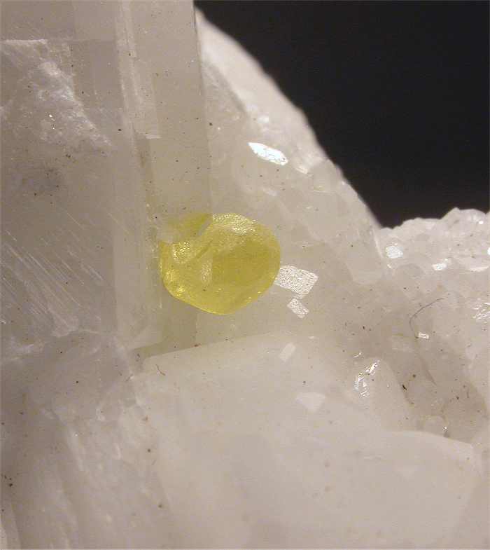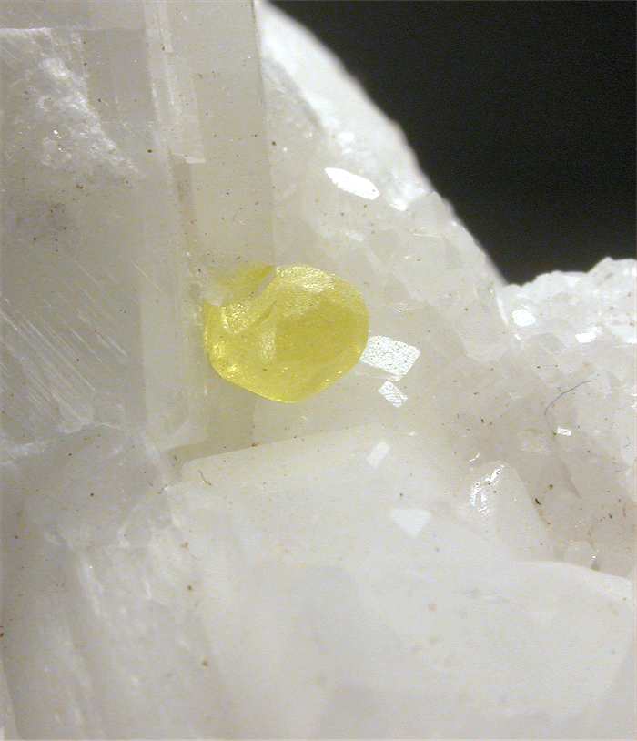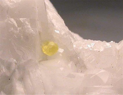 COLONNATA QUARRY, APUANE ALPS, CARRARA, ITALY - Bright yellow sulfur crystal of 0.3 cm in size, perfectly terminated, shows on the white marble. The crystals is close to some calcite crystals up to 0.6 cm in size. A classic, not frequent finding ! overall size is 7.2x5x4 cm. Weight is 215 gr.