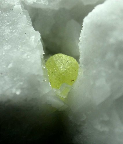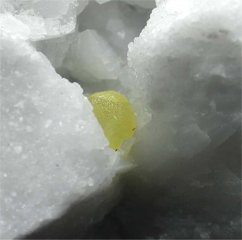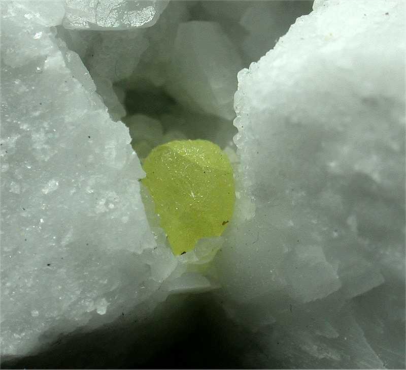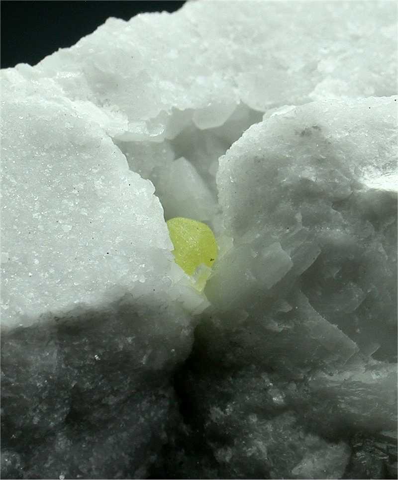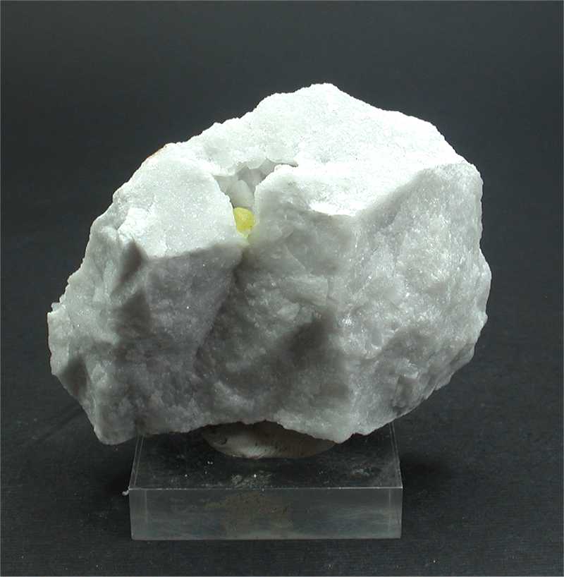 COLONNATA QUARRY, CARRARA, ITALY - A rare and classic from Apuane Alps. This marble specimen has a quite large cavity in whiche a terminated sulfur crystal is nested. The sulfur is 0.7 cm in size and shows anice yellow color. A nice specimen ! Overall size is 5x4.5x4 cm. Weight is 170 gr.