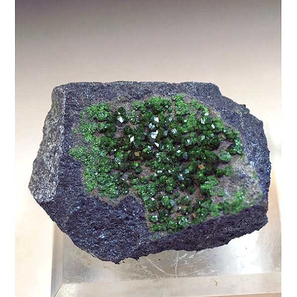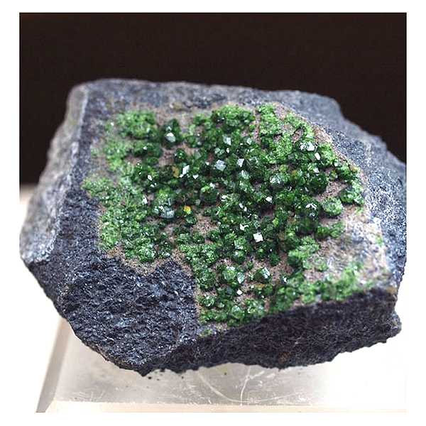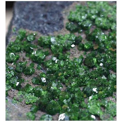 Saranovskii Mine, Gorozavodskii, Urals Region, Russian Federation - A very nice and valuable specimen with a lot of 1-2 mm bright green uvarovite crystals. A well known classic from Russia. Overall size 4x3x1 cm