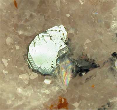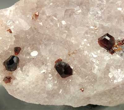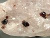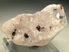 BRUMADO, BAHIA, BRASIL - Nice combination specimen. This crystalline magnesite rock hosts some terminated red uvite crystals around 0.4 cm and a nice metallic hematite blade of 0.6 cm ! Overall size is 6.5x3.5x3 cm.