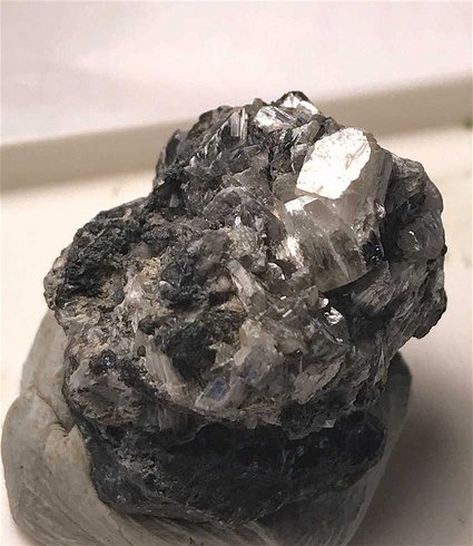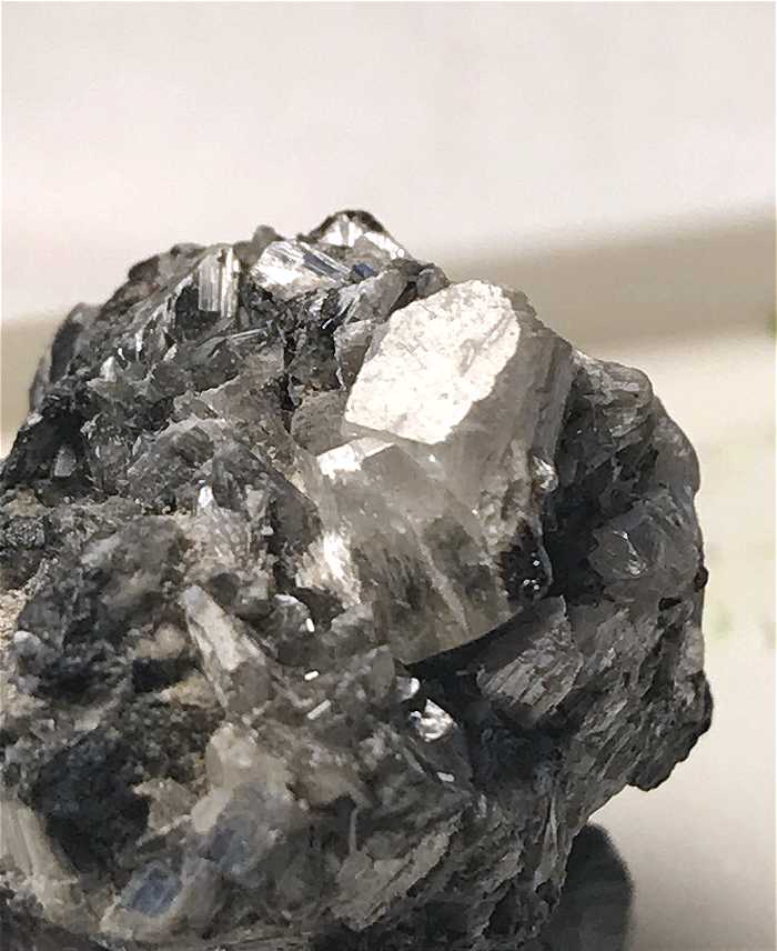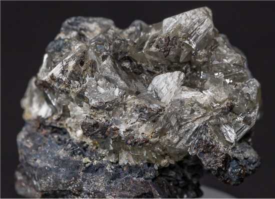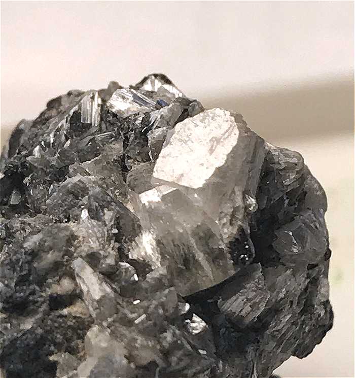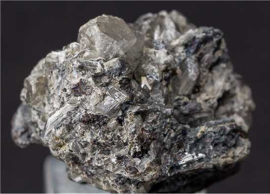 Colavi Mine, Colavi subdistrict, PotosÃ, Bolivia - A very good example of the very rare Antimony Oxide, Valentinite. The specimen has sharp prismatic crystals of Valentinite atop massive Galena up to 0.6 cm. Minor chips here and there, but still a good example of a very rare species. Overall size is 2.1 x 2.0 x 1.7 cm.