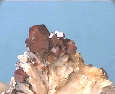 Mibladen, Marocco - Bright red 0.8 cm crystals show up on the top of a group of barite crystals. A brautiful combination from this famous locality. No damages ! 4x3x2.5 cm.