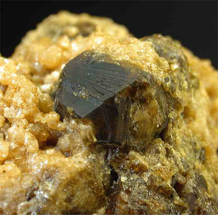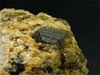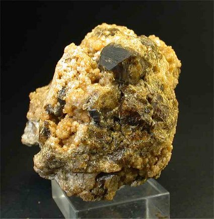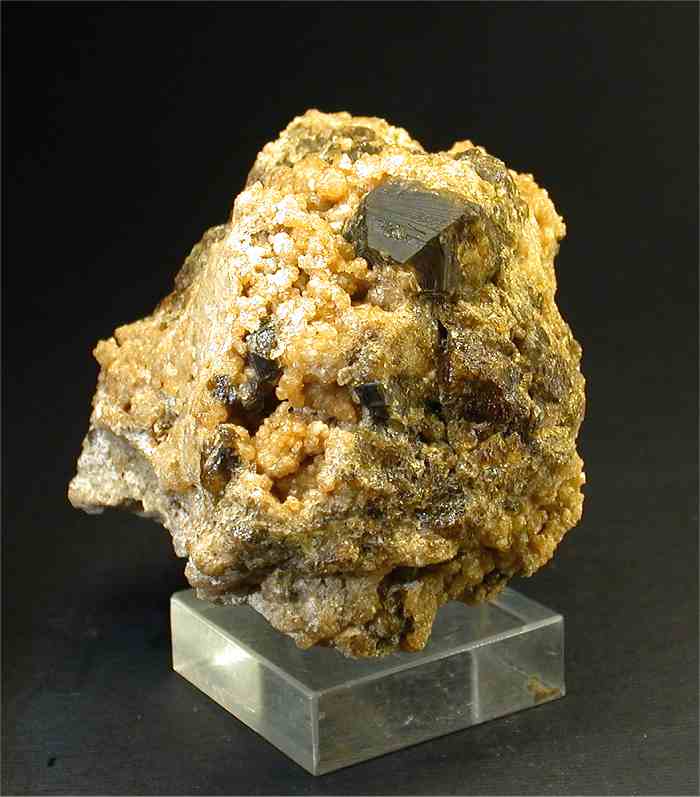 Pitigliano quarry, Grosseto, Tuscany, Italy - An old specimen probably from late 80ies when the quarry was still operating. The rock is entirely composed by a grossular rich matrix that hosts a large vesuvianite crystal. The vesuvianite is 1x0.5x1 cm in size and stands on the edge of a cavity filled by 1-2 mm grossular crystals. Overall size is 6.5c5.5x4 cm.