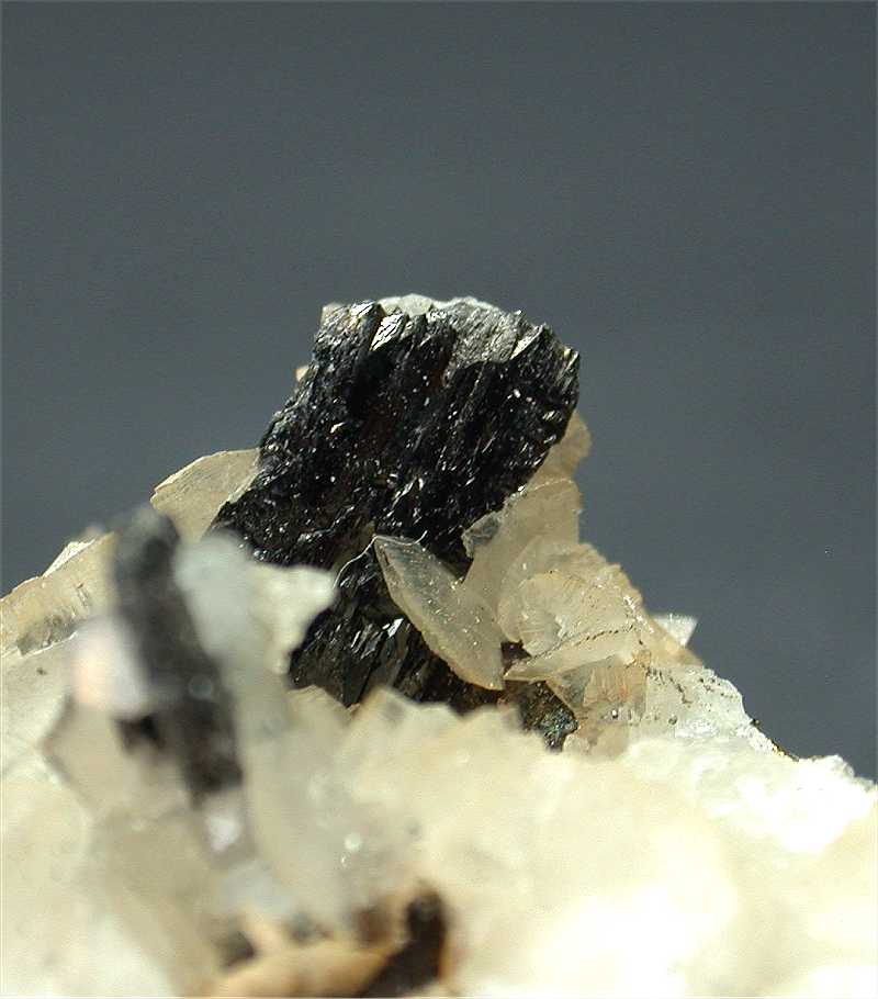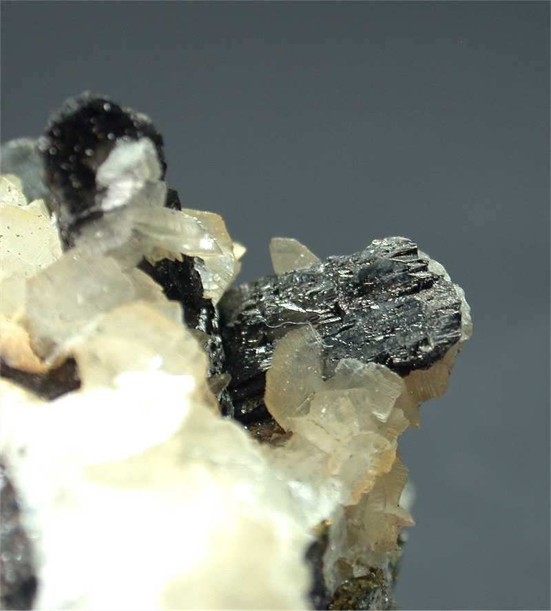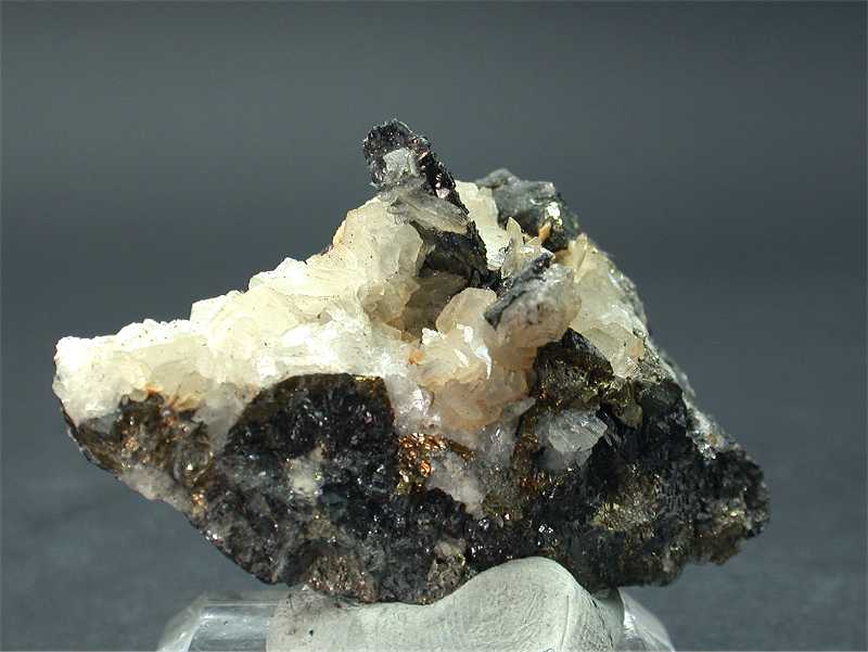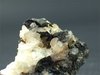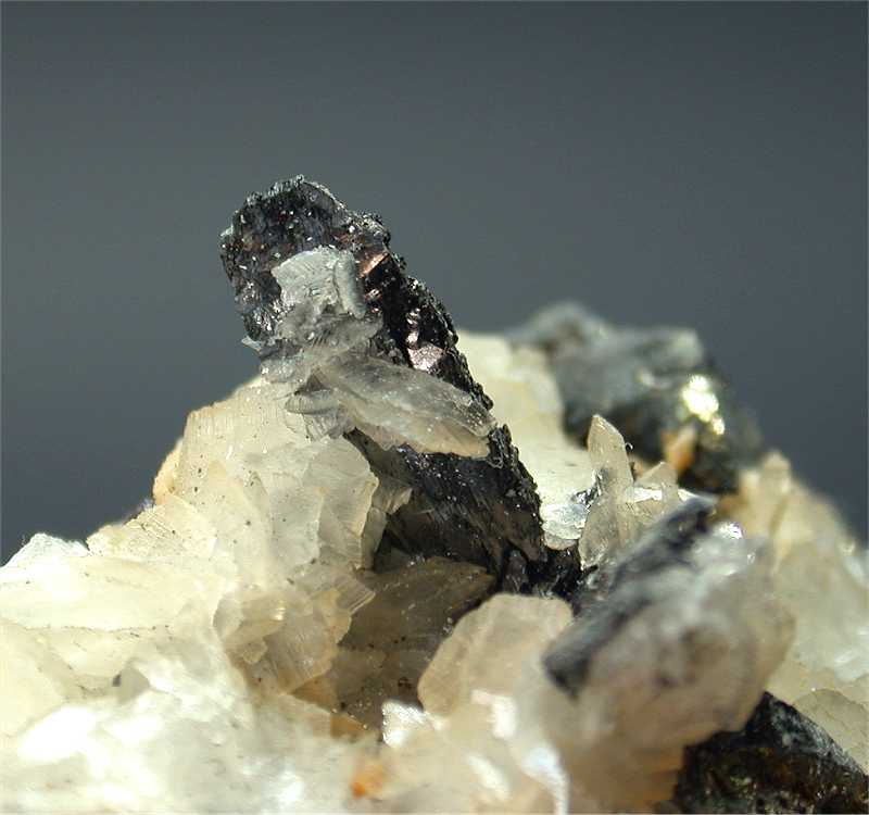 Baia Sprie Mine, Baia Sprie, Romania - A sulphide covered matrix with abundant chalcopyrite sphalerite and galena has a pair of black wolframite crystals on top, with two generations of calcite covering. The main crystal is 1.2 cm in size. Woframite was found along with scheelite in the late 1990s - this is quite typical of the habit. The crystals are not that well terminated. Overall size is 5.5x3x2 cm.