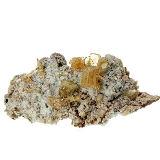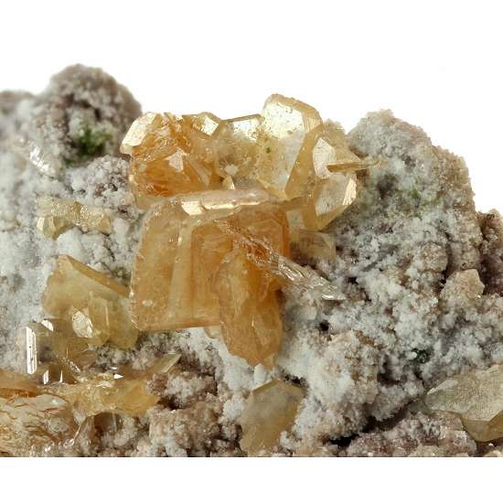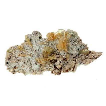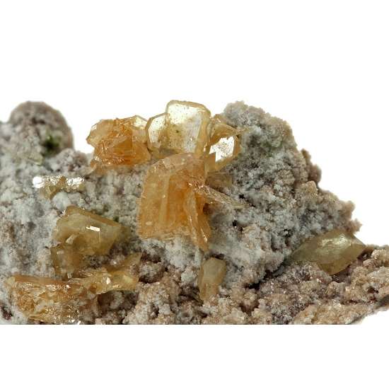 Tsumeb Mine, Otavi Highlands, Namibia - A bright specimen with several wulfenite crystals to the size of 0.6 cm on the edge ! The orange brown crystals of wulfenite stand on a drusy off-white dolomite matrix. Nice rock, no damages. Overall size is 4.1x1.9x1.2 cm