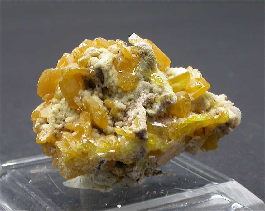 La Morita mine, Chihuahua, Mexico - Very nice specimen with a lot of wulfenite crystals the wulfenites are up to 0.5-0.6 cm on the edge and show a nice bright yellow color ! there are a dozen well…