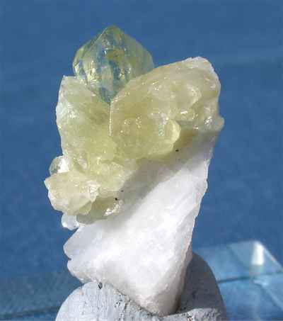 Corrego Frio, Linopolis, Minas gerais, Brazil - Nice light yellow/green crystals of brasilianite forming a cluster on the face of a quartz crystal. The brasilianites are up to 0.6-1 cm in size. No…