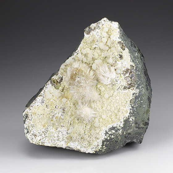 Kandivali Quarry, Mumbai, Maharashtra, India - Silky acicular crystallized okenite forming flat sprays of crystals and groupings to 3.0 cm across with spherical shaped crystals of gyrolite. A classic…