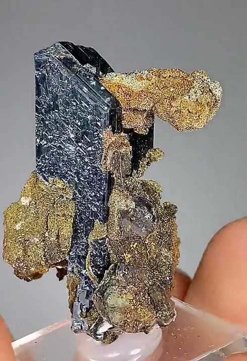 San Antonio Mine, Santa Eulalia District, Chihuahua, Mexico - A slightly translucent bluish green double terminated undamaged crystal of vivianite 1.0 cm in length perched nicely upon this 3.5 x 2.0…