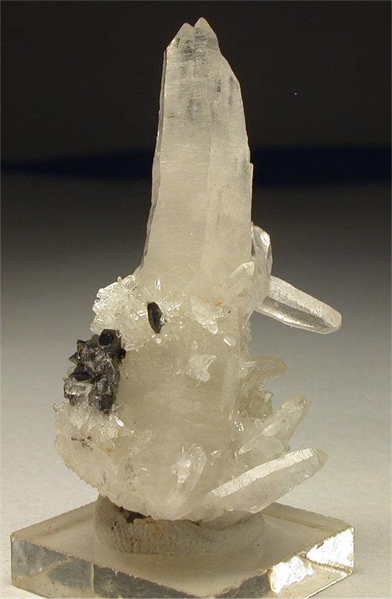 Hunza Valley, Northern Areas, Pakistan - A nice topaz of 1 cm in size shows on a face of a large terminated quartz crystal. Overall size is 5x3x2 cm