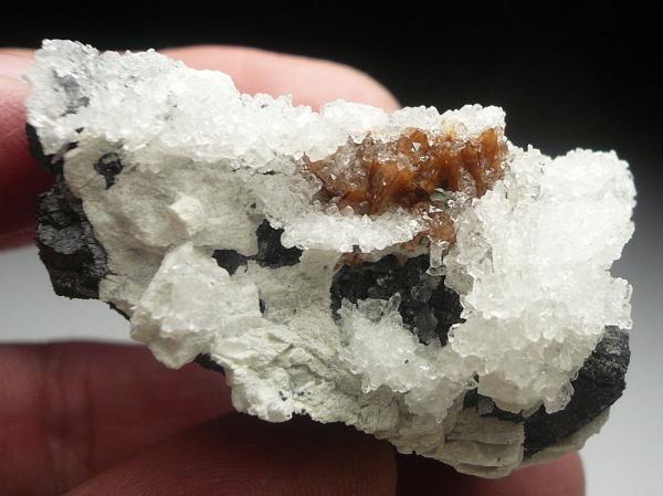 HUNAN PROV., CHINA - Real nice combination specimen ! This rock shows a large cluster of sphalerite crystals up to 0.5 cm. Their color is red/orange. Among the transparent quartz crystals a…