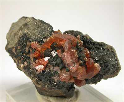 UCHUCHACUA MINE, LIMA DEPT., PERU - A bright cluster of deep red proustite crystals show up on the top of this specimen. The crystals are terminated and up to 2 mm. The cluster size is 0.6x0.3 cm.…