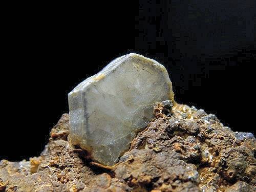 San Antonio Mine, Santa Eulalia District, Chihuahua, Mexico - A slightly translucent bluish green double terminated undamaged crystal of vivianite 1.0 cm in length perched nicely upon this 3.5 x 2.0…