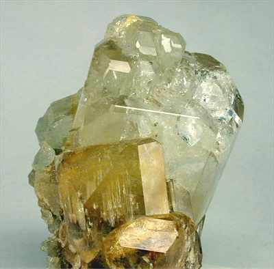 Corrego Frio, Linopolis, Minas gerais, Brazil - Nice light yellow/green crystals of brasilianite forming a cluster on the face of a quartz crystal. The brasilianites are up to 0.6-1 cm in size. No…
