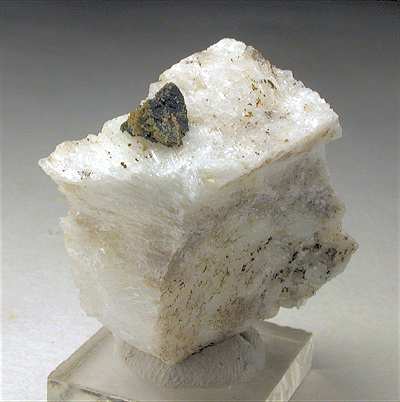 NAVEGADORES MINE,MINAS GERAIS, BRASIL - Fark helvite crystal of 0.6 cm in size shows up on the white albite of this specimen. Nice specimen of 3x2.5x2 cm.