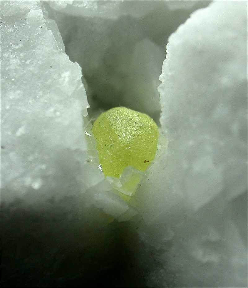 COLONNATA QUARRY, APUANE ALPS, CARRARA, ITALY - Bright yellow sulfur crystal of 0.3 cm in size, perfectly terminated, shows on the white marble. The crystals is close to some calcite crystals up to…