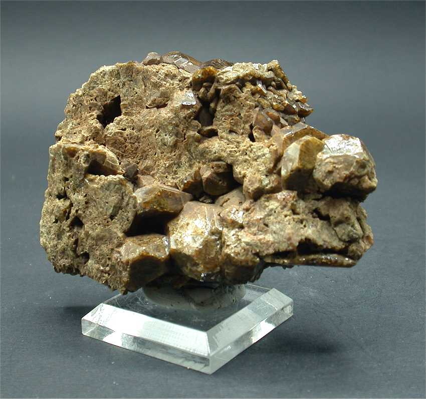 Colonnata quarry, Apuane Alps, Carrara, Italy - This marble specimen hosts a cluster of terminated deep brown/red sphalerite crystals of 0.4 cm nicely nested in an open cavity. The cluster shows…