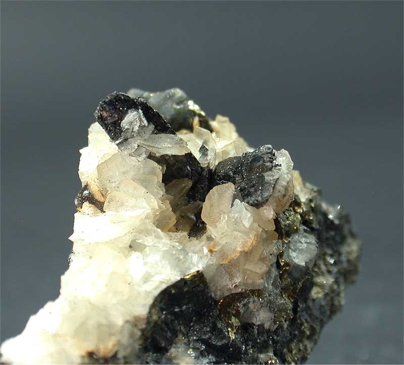 Baia Sprie Mine, Baia Sprie, Romania - A sulphide covered matrix with abundant chalcopyrite sphalerite and galena has a pair of black wolframite crystals on top, with two generations of calcite…HESSONITE