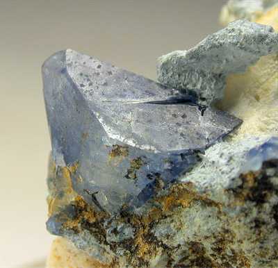 SAN BENITO GEM MINE, SAN BENITO CO., CA, USA - On the white riolite matrix there are 2 well shaped and bright blue benitoites of the size of 0.3 and 0.4 cm. Small but nice ! Other partial crystals ar…