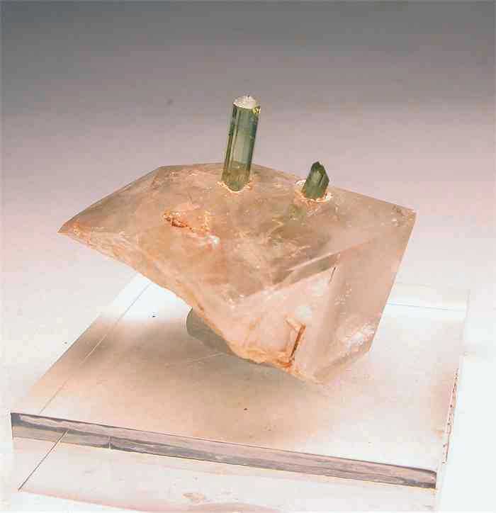 Minas Gerais, Brazil - A very nice and esthetic specimen ! A quartz point, perfectly terminated hosts a couple of bright green elbaites that emerge from the quartz crystal. A third elbaite is…