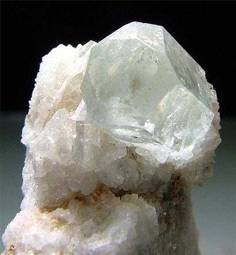 Shigar Valley, Northern Areas, Pakistan - Very nice thumbnail hosting a single gemmy prism of aquamarine attached to the edge of a feldspar/cleavelandite matrix. The aquamarine is 1 cm in size and…